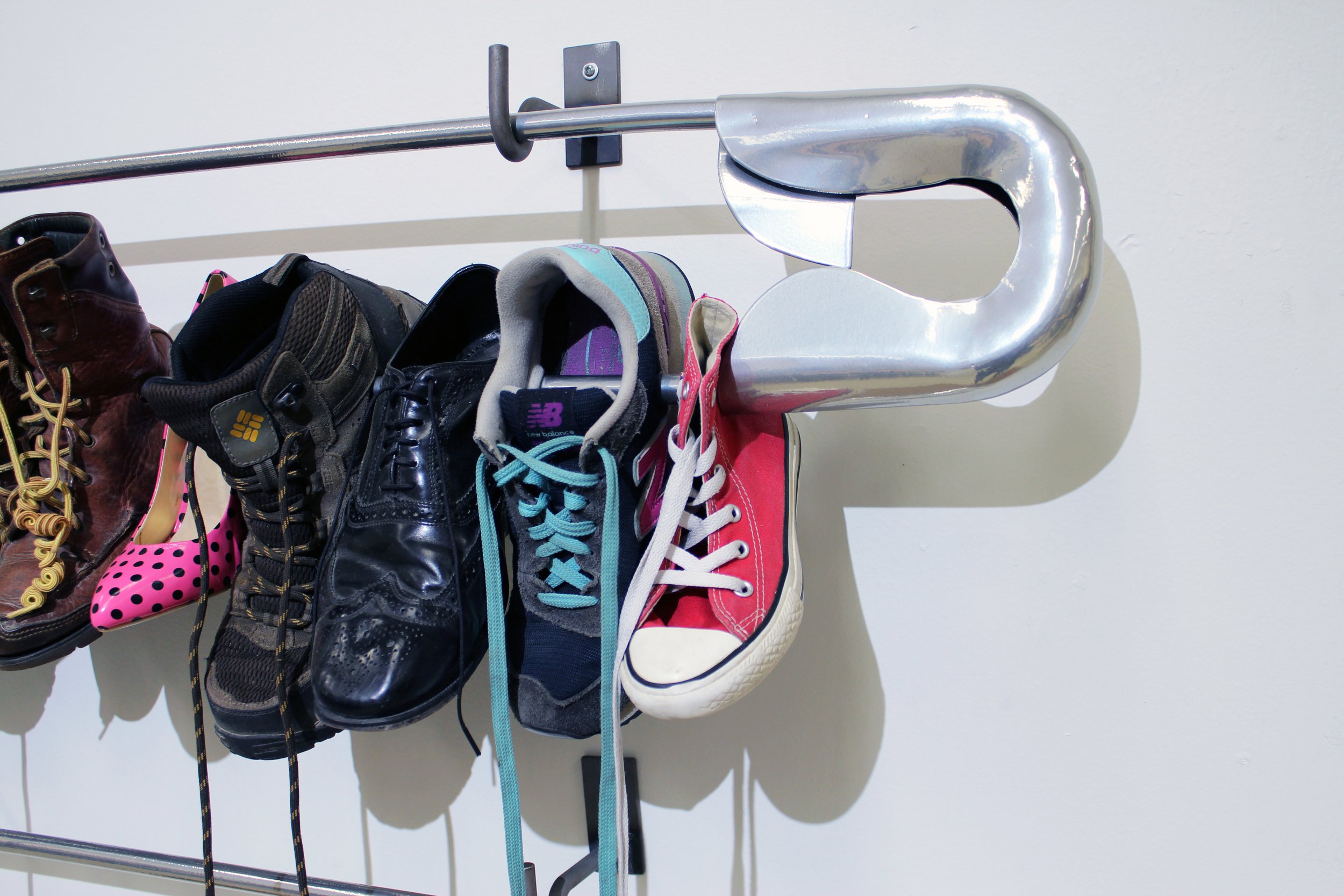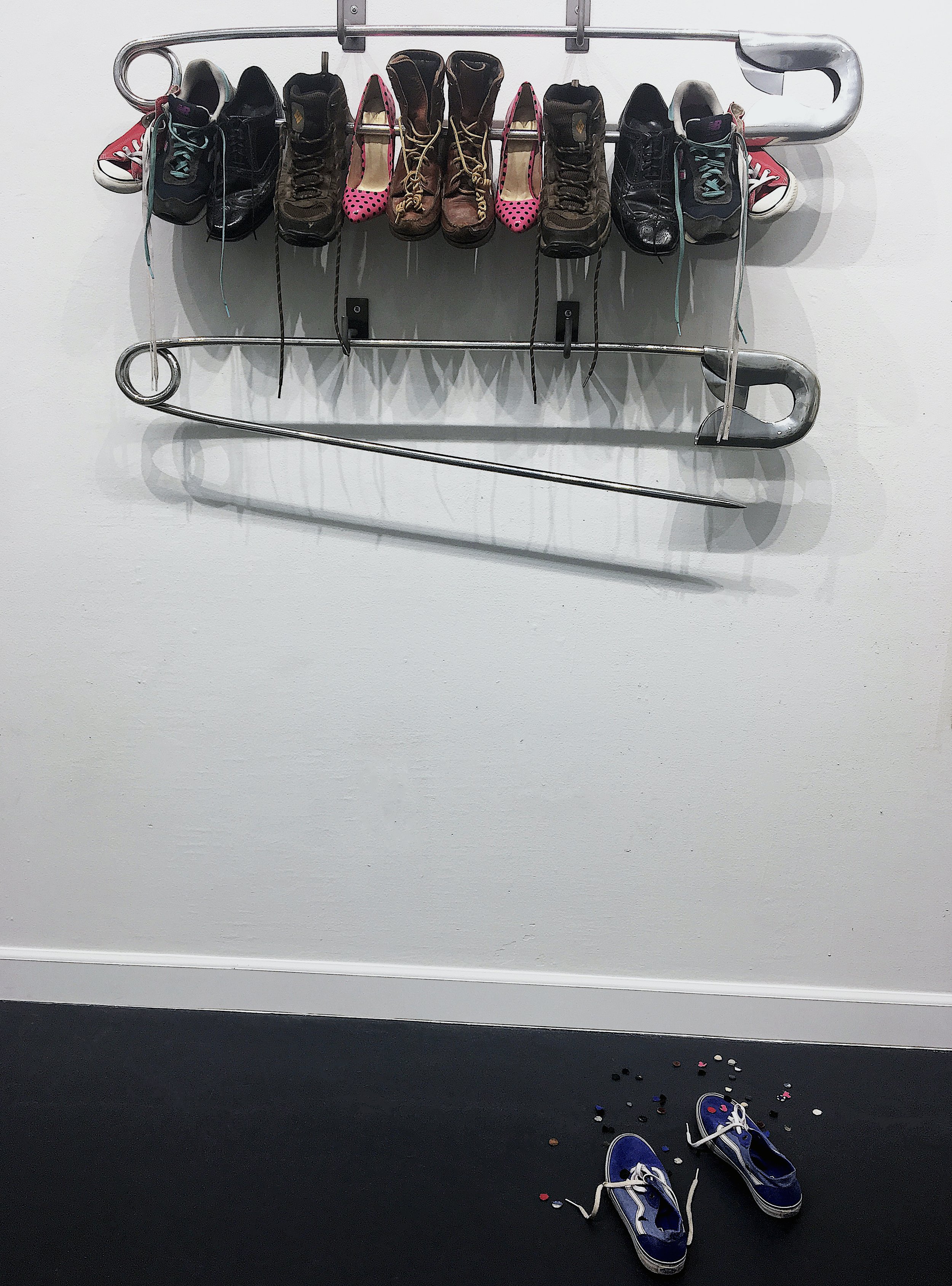 Pinned, a sculptural work that was inspired in a time of political transitions, uncertainties, and unrest. The shoes on the safety pin are not merely shoes, they are a representation of “someone’s shoes”. The work discusses empathy, awareness, reflection, and the feeling of safety.
